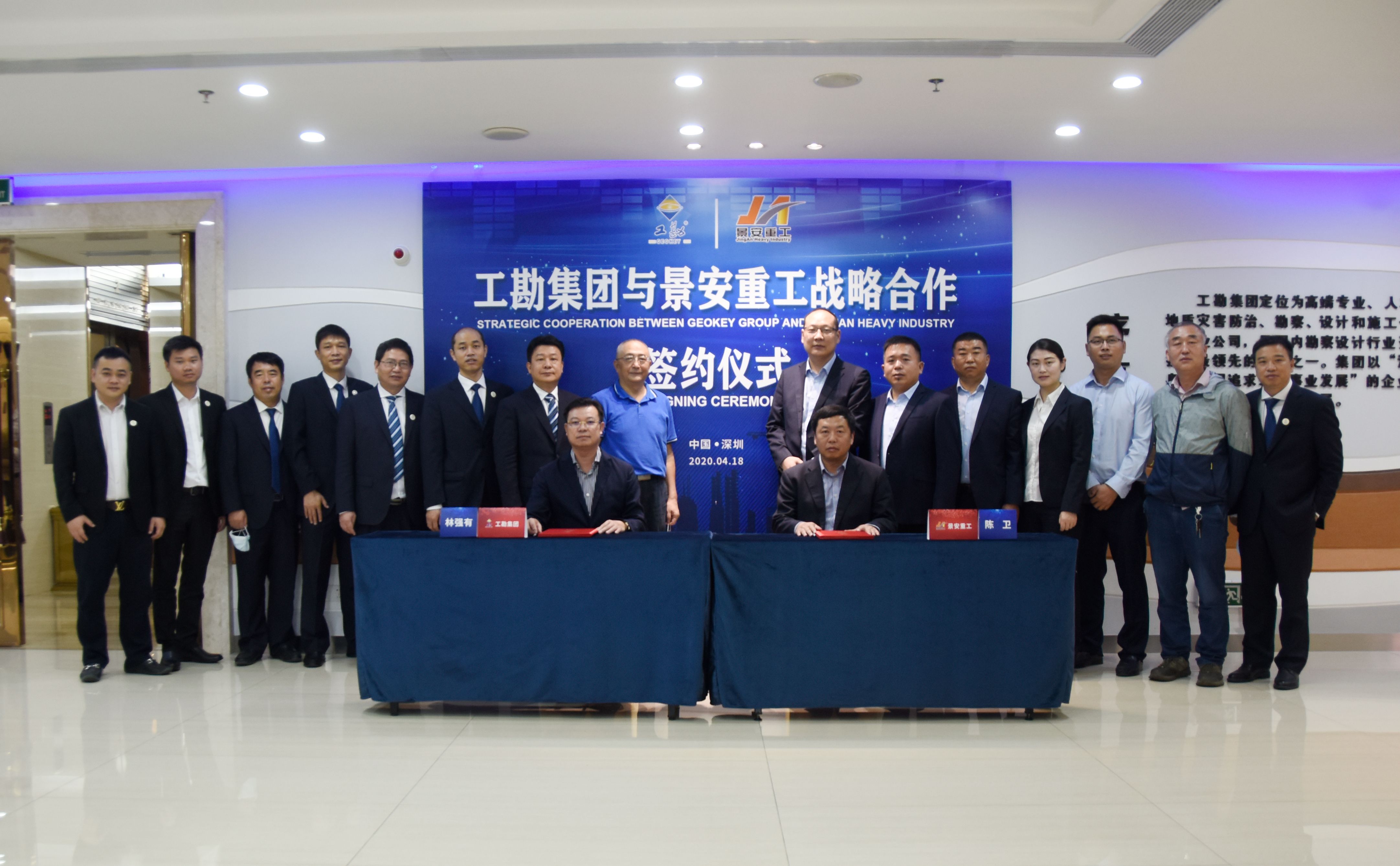 2020年4月18日上午,工勘集團(tuán)與徐州景安重工機(jī)械制造有限公司(以下簡(jiǎn)稱景安重工)戰(zhàn)略合作框架協(xié)議簽約儀式在工勘集團(tuán)總部舉行。景安重工董事長(zhǎng)陳衛(wèi)、總經(jīng)理魏垂勇、副總經(jīng)理李景峰,工勘集團(tuán)董事長(zhǎng)林強(qiáng)有,工勘巖土集團(tuán)副董事長(zhǎng)雷斌、總經(jīng)理李紅波、總工程師王賢能、副總經(jīng)理付文光、李新元等雙方領(lǐng)導(dǎo)及相關(guān)部門負(fù)責(zé)人出席了簽約儀式,深圳市土木建筑學(xué)會(huì)巖土工程專業(yè)委員會(huì)主任劉小敏等嘉賓受邀見(jiàn)證了簽約。